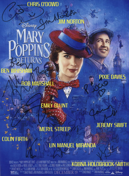12"x 16" signed photo, Signed by: Chris O'Dowd, Jim Norton, Ben Whishaw, Rob Marshall, Pixie Davies, Emily Blunt, Mery Streep, Jeremy Swift, Colin Firth, Lin Manuel Miranda and Kobna Holdbrook-Smith.