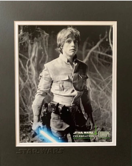 LUKE SKYWALKER MOUNTED PHOTO - Official Pix Celebration Europe 2013 A scarce OPX Star Wars Celebration Europe Germany 2013 mounted photo. An 11"x14 double mount with a matt black and white 8"x10" photo at the centre. The outer mount is also embossed with the Star Wars logo. Brand new condition and bagged.
